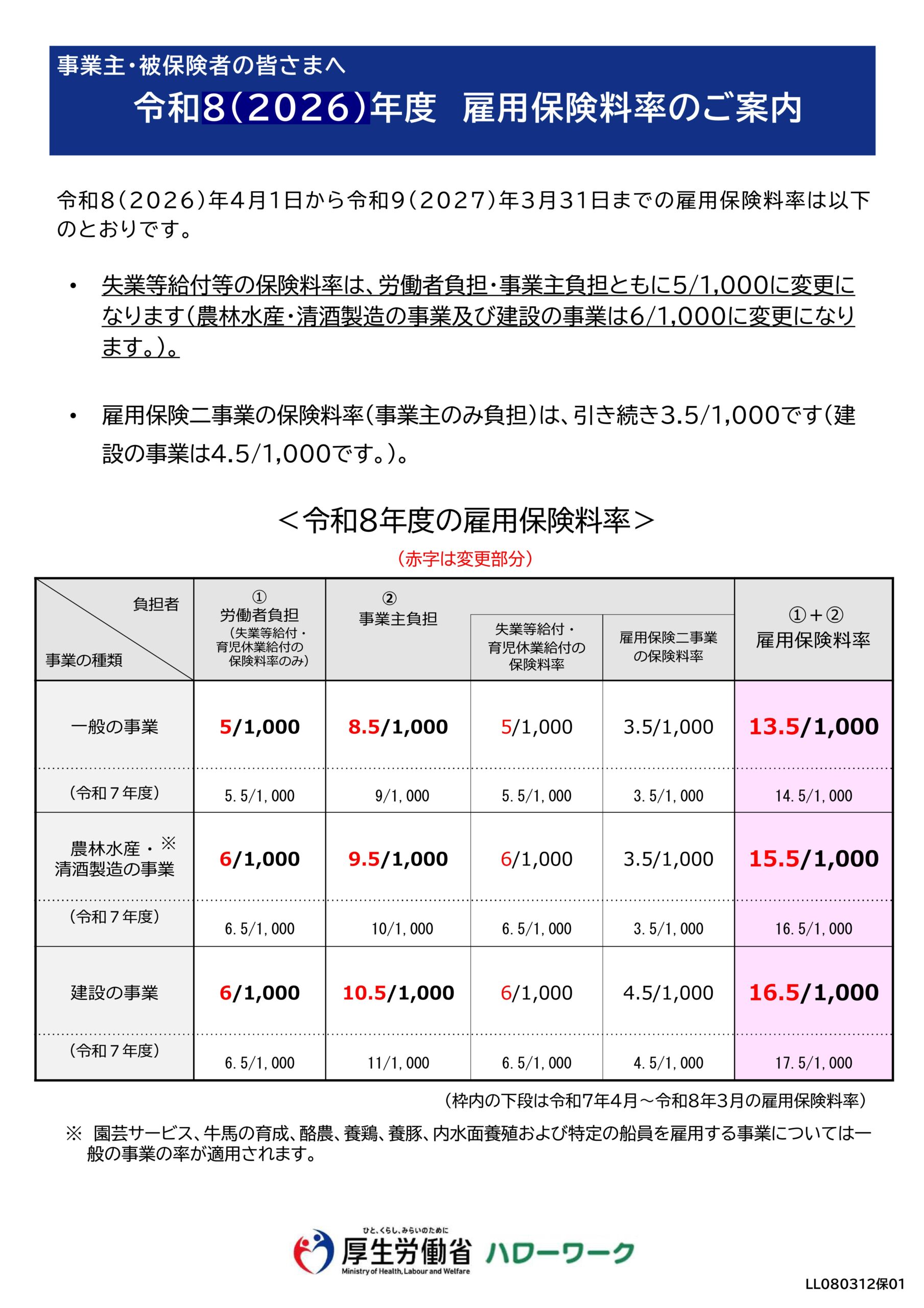 令和8年4月1日から令和9年3月31日までの雇用保険料率が、次のとおり変更となります。